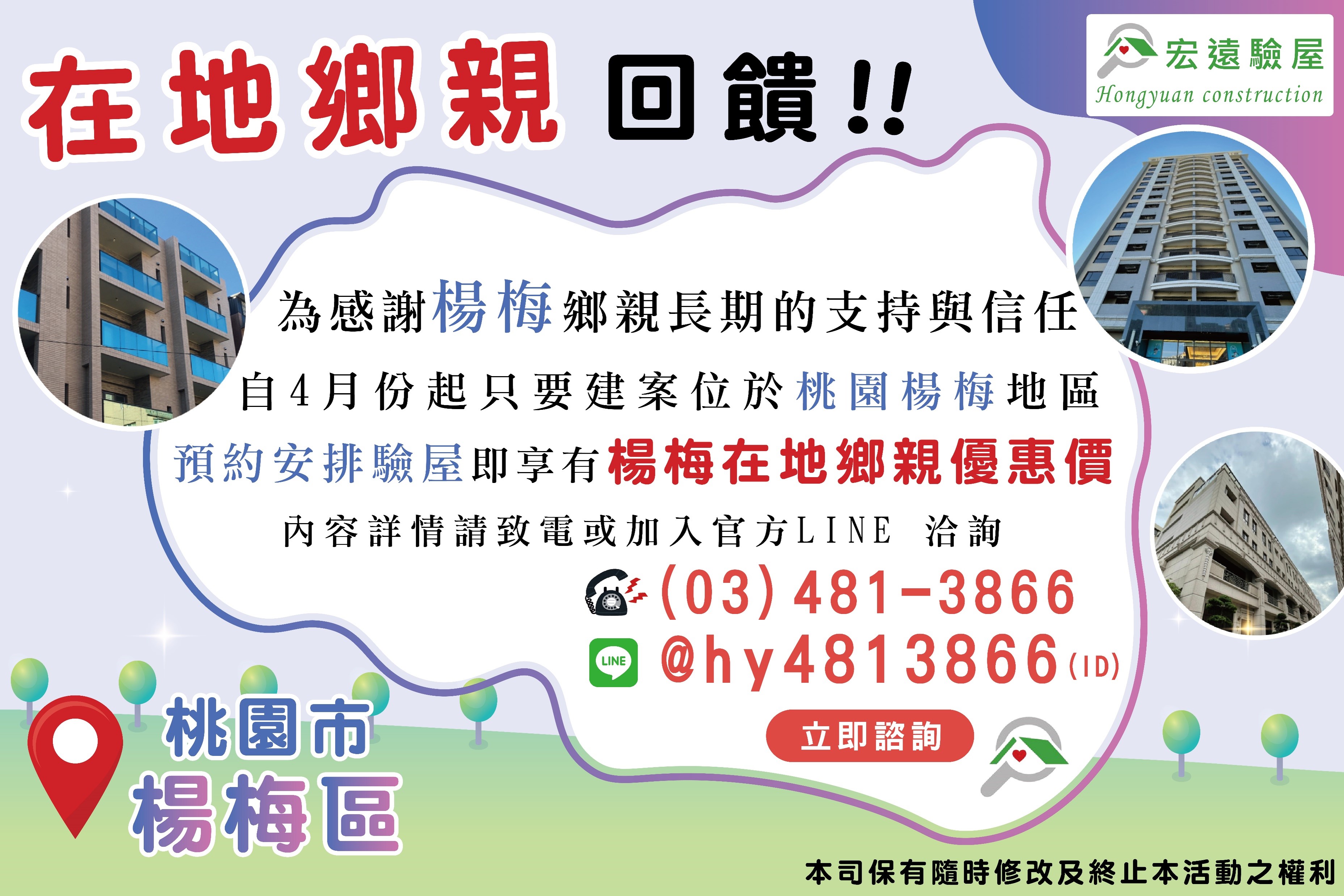 【公告】2/14(六)~2/22(日)春節公休,宏遠全體員工!訊息統一,於2/23(一)上班日依序回覆~【驗屋相關問題請加入官方line> (ID:@hy4813866) 留言!!】 ◆2月最新優惠 請洽官方line ! 早鳥團購驗屋最高享75折含稅優惠價 ! 【 LINE ID : @hy4813866;來電諮詢 : (03)-481-3866 】 【南崁-安美大望】團購驗屋戶數近20戶 ! 感謝住戶信任與支持,專案優惠價熱烈進行中 ! 歡迎住戶加入洽詢預約。 【商家合作優惠-舍榀 超靜電防霾紗網】官方LINE領取優惠碼,居住品質Level Up ! 驗屋服務新項目【公設點交】,以專業公正第三方協助社區管委會與建商完成點交,相關報價請洽官方Line客服。 2026年團購驗屋超值優惠方案開放預約中,最高享75折含稅優惠價 ! 【 LINE ID : @hy4813866;來電諮詢 : (03)-481-3866 】 快訊 ! Google評論突破1200則 ! ! ❝盡心服務,提供委託人專業驗屋需求❞